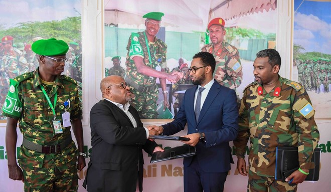 Heshiis si rasmi ah oo loogu wareejinayay ayaa waxaa kala saxiixday ergeyga Midowga Afrika ee Soomaaliya (SRCC) ahna Madaxa ATMIS Ambassador Mohamed El-Amine Souef iyo Wasiiru Dowlaha Gaashaandhigga Soomaaliya, C/nuur Daahir Fiidow.
