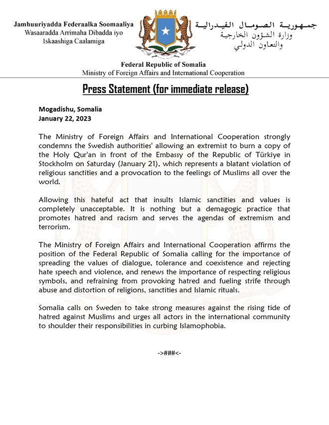 Dowladda Soomaaliya ayaa ugu baaqday Sweden inay qaado tallaabooyin adag oo ka dhan ah nacaybka sii kordhaya ee ka dhanka ah Muslimiinta, waxayna ku boorisay dhammaan jileyaasha beesha caalamka inay qaataan mas’uuliyadda ka saaran ka hortagga Islaam nacaybka.
