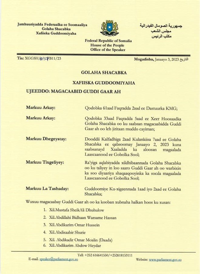 Hoos ka akhriso Warqadda Guddiga uu magacaabay guddoomiyaha Golaha Shacabka:-