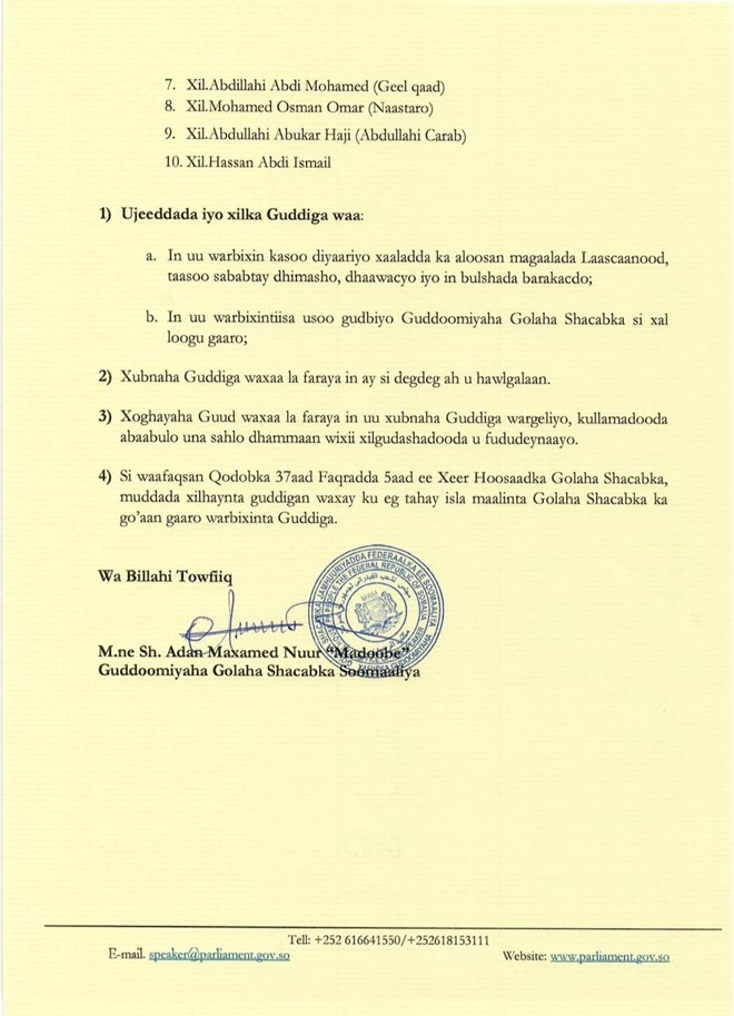 newsinsideGuddigaan uu magacaabay guddoomiyaha Golaha Shacabka Sheekh Aadan Madobe ayaa ka kooban ilaa 10 mudane oo ka tirsan Xildhibaanada Golaha Shacabka ee Baarlamaanka Fedaraalka Soomaaliya.