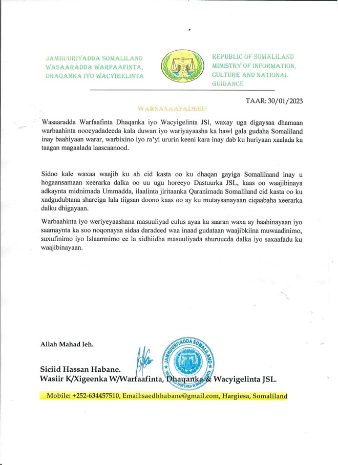 "Wasaarada Warfaafinta Dhaqanka iyo Wacyigalinta Jamhuuriyada Somaliland, waxay uga digaysa dhamaan warbaahinta noocyadeeda kala duwan, iyo wariyayaasha ka howlgala gudaha Somaliland in ay baahiyaan warar, warbixino iyo ra'yi ururin dab kusii hurin karta xaalada ka taagan Laascaanood".
