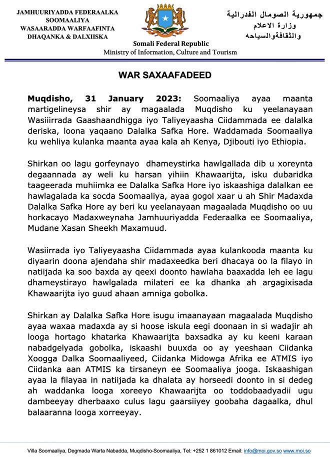 Talaado, January, 31, 2023 (HOL) - Dowladda Fedaraalka Soomaaliya ayaa war rasmi ah kasoo saartay shirweyne Ka dhacayo gudaha magaalada Muqdisho oo ay ka qeybgalayaan madaxda dalalka ciidamadooda ka joogaan Soomaaliya, waxaana shirkaan oo ay martigalineyso dowladda Soomaaliya ayaa lagu casuumay Wasiiradda Gaashaandhiga iyo Taliyeyaasha ciidamada dalalka dariska ah ee loo yaqaano dalalka safka hore.