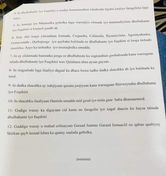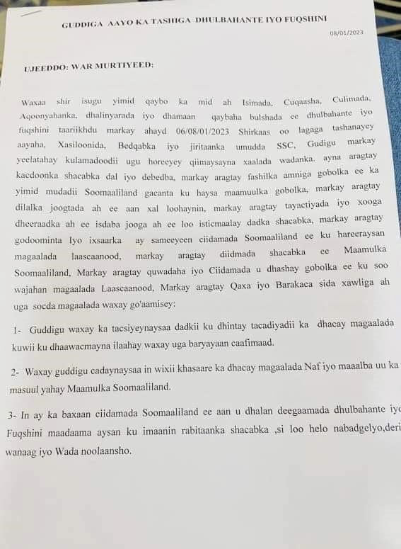Axad, January, 8, 2023 (HOL) - Shir ay saakay isugu yimaadeen cuqaasha iyo waxgaradka beelaha Dhulbahante iyo Fiqishini, shirkaas oo ka dhacay magaalada Laascaanood, ayaa bayaan kasoo baxay lagu sheegay in ciidamada Somaliland ay isaga baxaan magaalada Laascaanood iyo gobolka Sool.