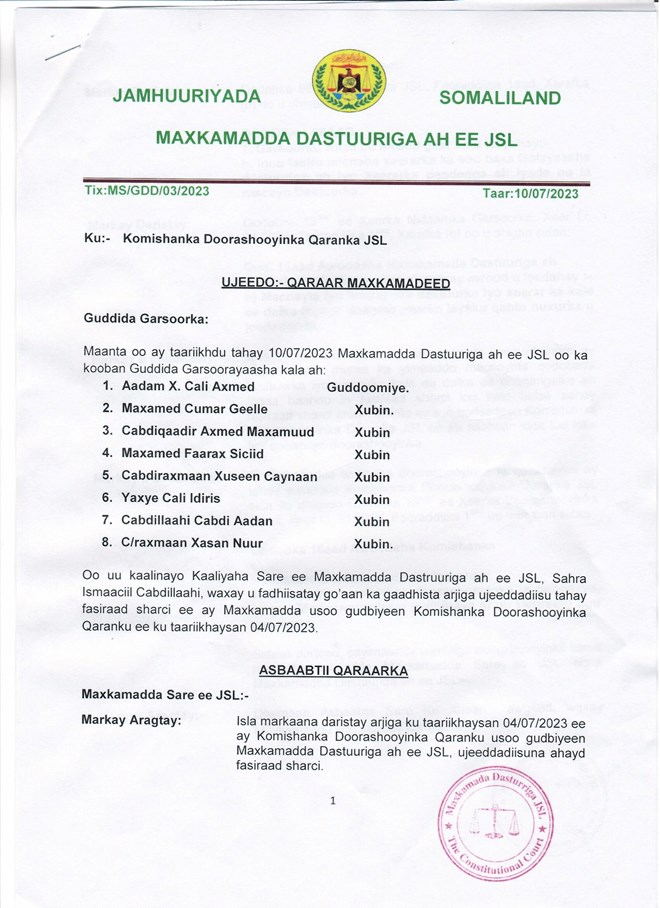 Isniin, Luulyo, 10, 2024 (HOL) - Maxkamada Dastuuriga ah ee Somaliland ayaa gabi ahaanba diiday codsigii tafsiirka sharci ee ay guddida doorashooyinku u gudbiyeen.