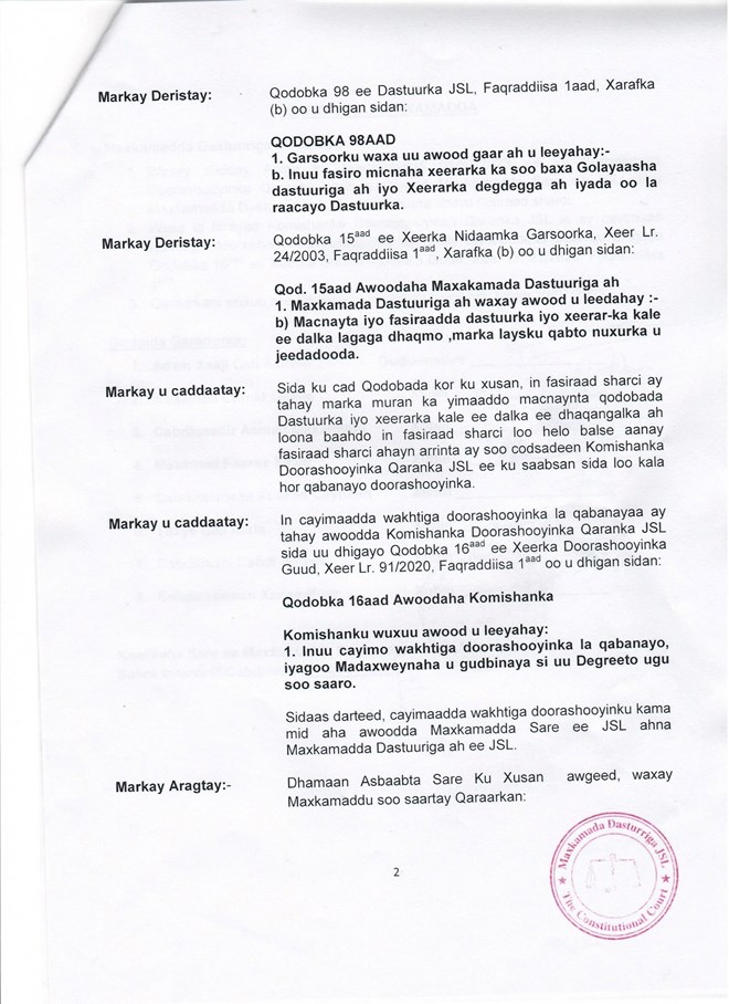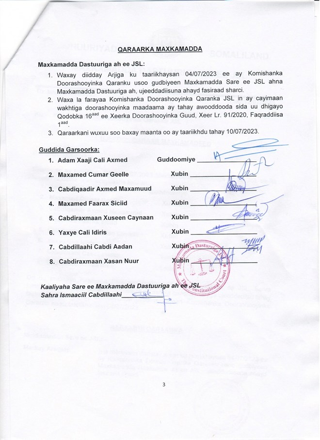 "Maxkamada dastuuriga ahi waxay diiday arjiga ku taariikhaysan 4,7,2023 ee Koomiishanka Doorashooyinka Qaranku usoo gudbiyeen Maxkamada Sare ee JSL ahna maxkamada dastuuriga ah, u jeedadiisuna ahayd fasiraad sharci" ayaa lagu yidhi qoraalka maxkamada.