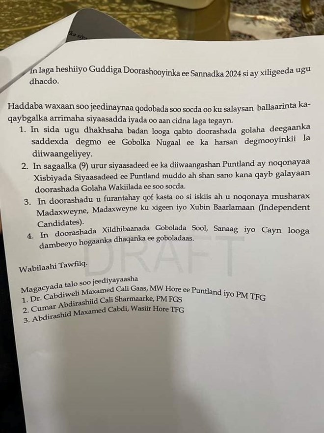 Talaado, Luulyo, 11, 2024 (HOL) - Raysal wasaaraayashii hore ee Soomaaliya, Cabdiweli Gaas iyo Cumar Cabdirashiid Cali Sharmaarke, ayaa maanta soo saaray talo soo jeedin ku aadan habka loo wajahayo doorashooyinka Puntland.
