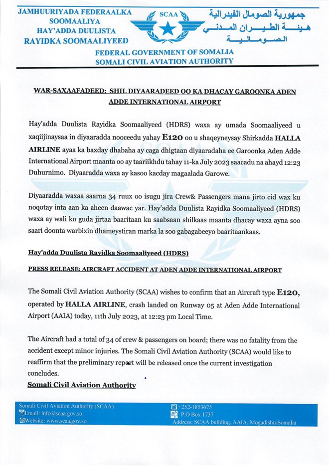 newsinsideWarbixin horudhac ah oo kasoo baxday hay'adda duulista ayaa lagu sheegay in diyaaraddu ay ka baxday dhabbaha ay ku degto, taasoo ahayd sababta ay shilka u gashay.