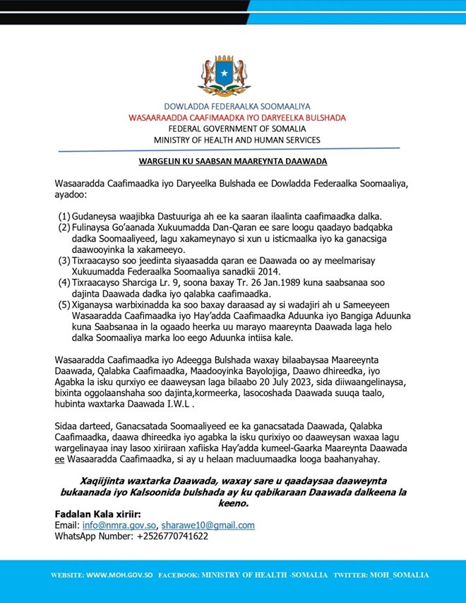 "Soodejiyaasha alaabta caafimaadka, daawooyinka la isku qurxiyo, iyo daawo dhireedka waxaa lagula talinayaa inay la xiriiraan Xafiiska Ku-meel-gaarka ah ee Maamulka Dawooyinka Qaranka (NMRA) ee hoos yimaada Wasaaradda Caafimaadka iyo Adeegyada Aadanaha, si loo helo macluumaad dheeraad ah oo arrintan la xiriira," ayaa lagu yiri bayaanka.