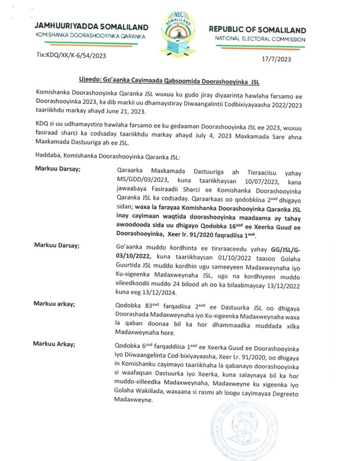 Isniin, Luulyo, 17, 2023 (HOL) - Guddida Doorashooyinka Somaliland ayaa ku dhawaaqay in doorshada ururadu ay qabsoomayso 28 December 2023, isla markaana doorashada madaxtooyadu ay dhaci doonto 13 November 2024.