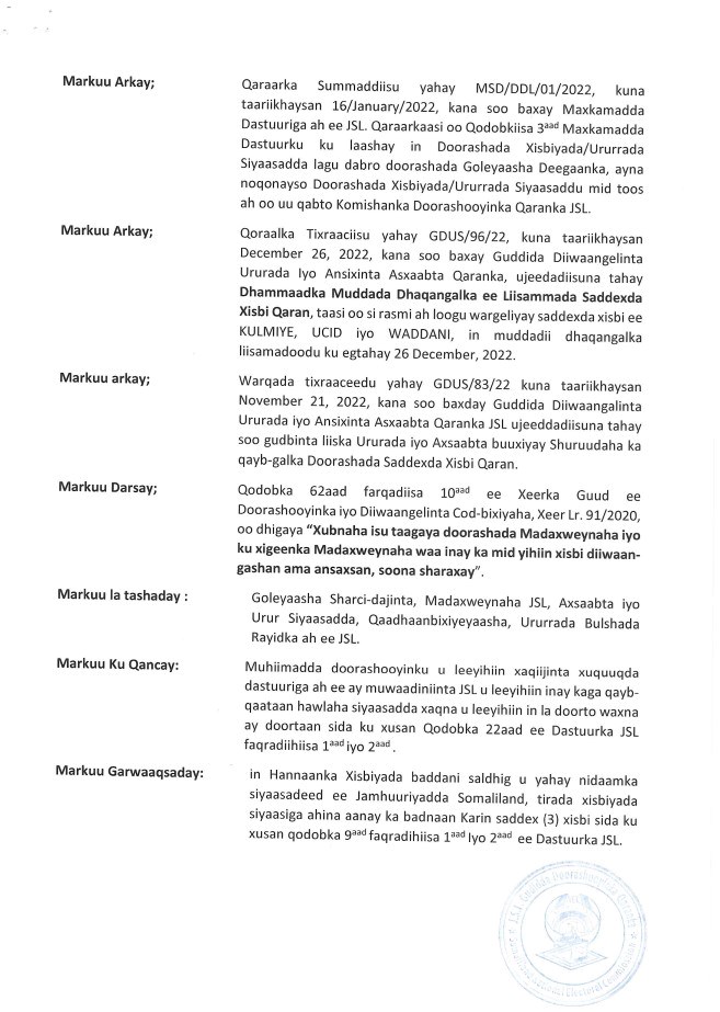 "Koomiishanku waxa uu go'aamiyay in doorashada xisbiyada qaranka la qabanayo taariikhdu markay tahay 28 December 2023, si loo helo saddex xisbi qaran oo ansaxsan, lana siiyo shahaadada xisbinimo ee 10 ka sanno ah" ayaa lagu yidhi qoraalka