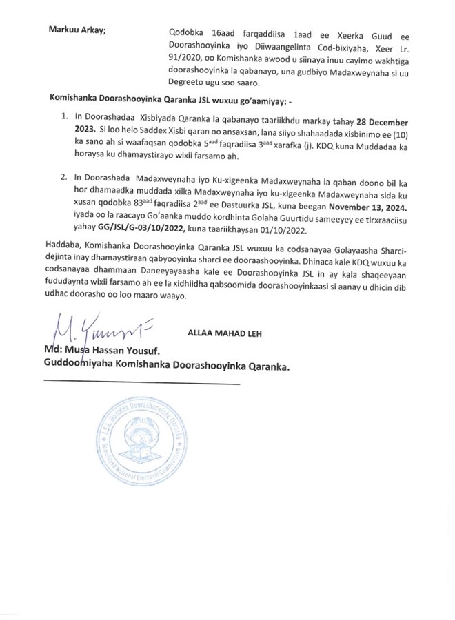 "Koomiishanku waxa uu go'aamiyay in doorashada madaxweynaha iyo ku xigeenkiisa la qaban doono bil ka hor mudada xilka madaxweynaha iyo ku xigeenkiisa sida ku xusan qodobka 83aad faqradiisa 2aad ee dastuurka JSL kuna beegan 13 November 2024" ayaa lagu yidhi qoraalka