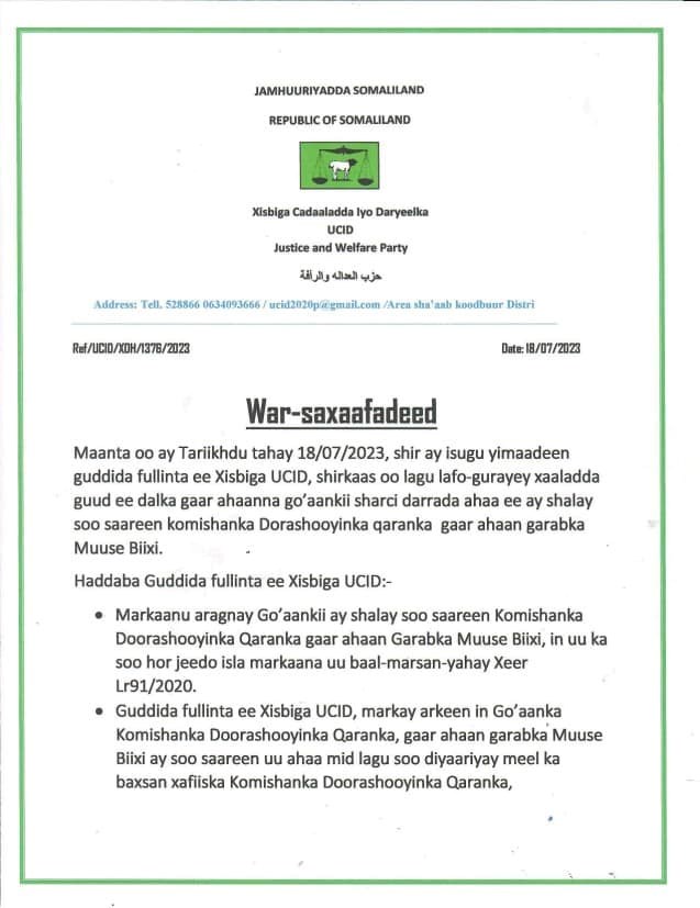 "Guddida fulinta ee xisbiga UCID waxa ay go'aamisay in go'aankii kasoo baxay garabka Muuse Biixi ee Koomiishanka Doorashooyinka Qaranka ee ku taariikhaysnaa 17/7/2023 anay si naba u aqbalin go'aanka sharcidarada ah ee waxba kama jiraan ka ah" ayaa lagu yidhi warsaxaafadeeda.