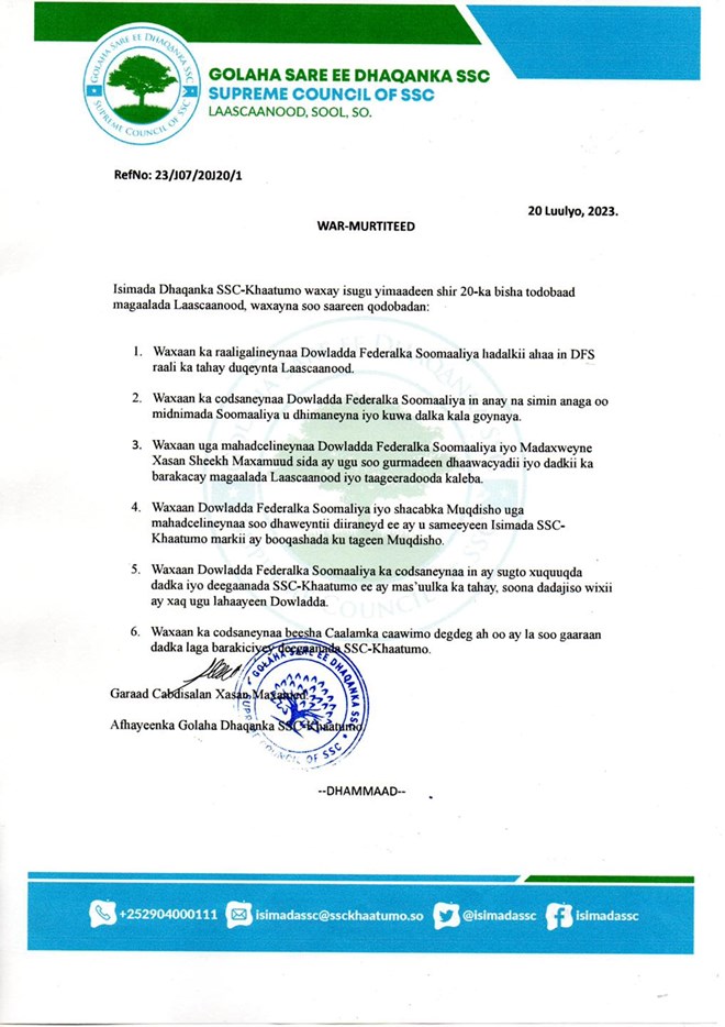 newsinsideBayaan kooban oo kasoo baxay golaha sare ee SSC-Khaatumo, ayaa lagu sheegay, in dowladda federalka laga raali galiyay hadalkii ahaa in ay Somaliland heshiis kula tahay duqaynta ay ka geysanayso magaalada Laascaanood.