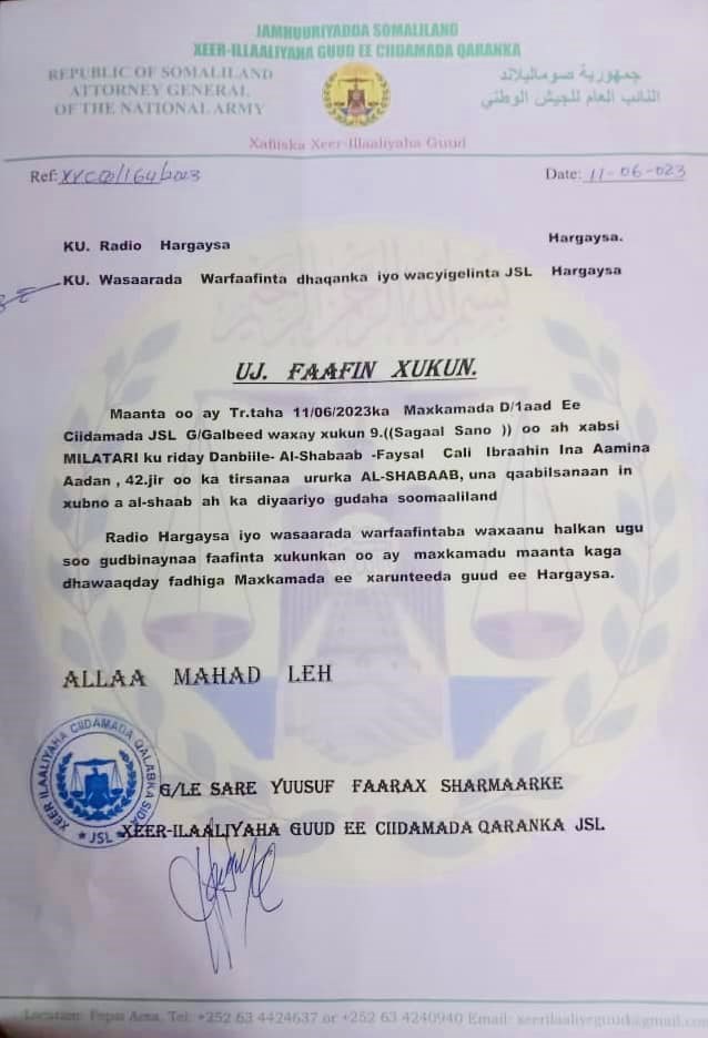 newsinsideQoraal lagu daabacay bogga Wasaarada Gaashaandhiga Somaliland ayaa lagu sheegay in Faysal Cali Ibraahin oo Al Shabaab ka tirsanaa lagu riday xukun xabsi ciidan ah.