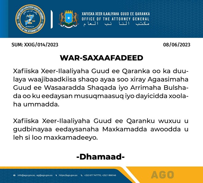 Jimco, Juun, 9, 2023 (HOL) - Agaasimihii wasaaradda shaqada iyo arrimaha bulshada ee xukuumadda Soomaaliya, C/llaahi Maxamed Cali ayaa xabsiga loo taxaabay, sida lagu sheegay war kasoo baxay taliska qeybta Guud ee booliska Gobolka Banaadir.