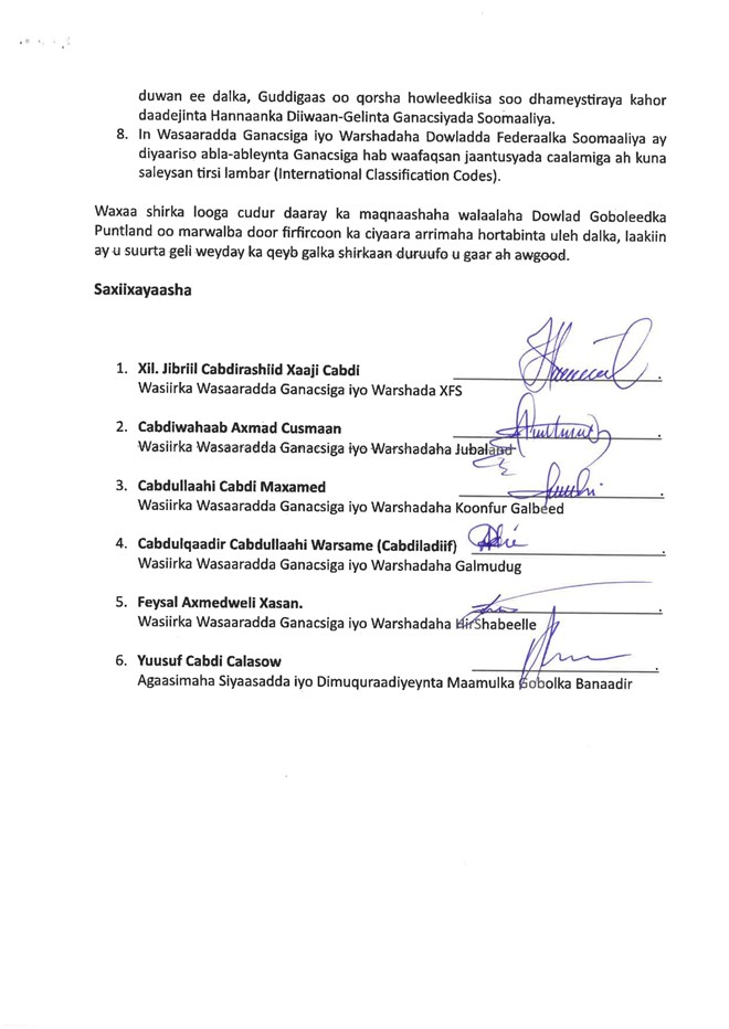 Waxaa sidoo kale Wasaaradda Ganacsiga Soomaaliya iyo Wasaaradaha dowlad goboleedyada ay isla meel dhigeen mideynta naqshada iyo xogta ku qoran dukumintiyada, islamarkaana kaliya ay ku kala duwanaadaan saxiixa iyo Logada.