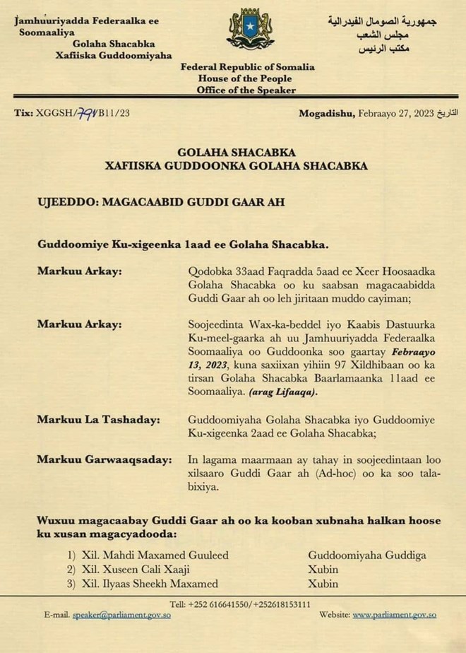 Jimco, March, 3, 2023 (HOL) - Guddoomiye ku xigeenka 1-aad ee barlamaanka ahna ku simaha guddoomiyaha, xildhibaan Sacdiyo Yaasiin Samatar, ayaa magacowday guddi kasoo talo bixiya mooshin ay soo gudbiyeen ku dhawaad 100 xildhibaan.