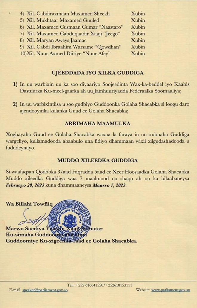 Gudddoomiye ku xigeenka koowaad ee barlamaanka ayaa illaa todobada bishan March u qabatay guddigan inay kusoo gudbiyaan talo soo jeedintooda, si loogu daro ajandaha guud ee barlamaanka.