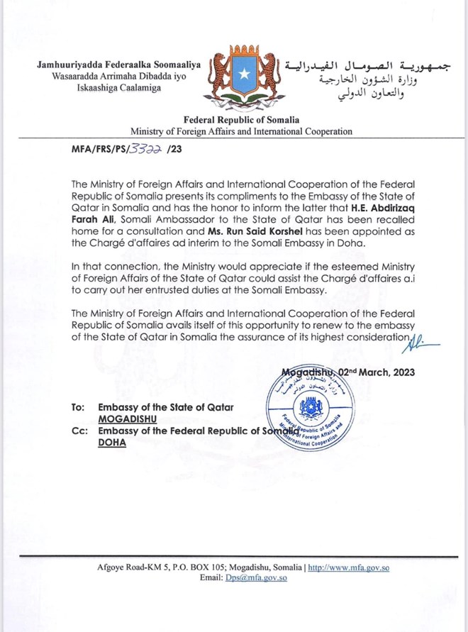 Waxaa sidoo kale Wasaaradda ay si ku meel gaar ah sii hayaha Safaarada Soomaaliya ee Qatar ugu magacawday Ruun Saciid Qooraheel, sida lagu shaaciyay qoraalka kasoo baxay Wasaaradda arrimaha Dibadda Soomaaliya.