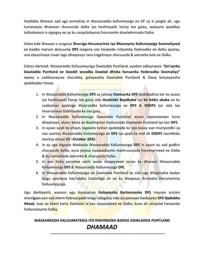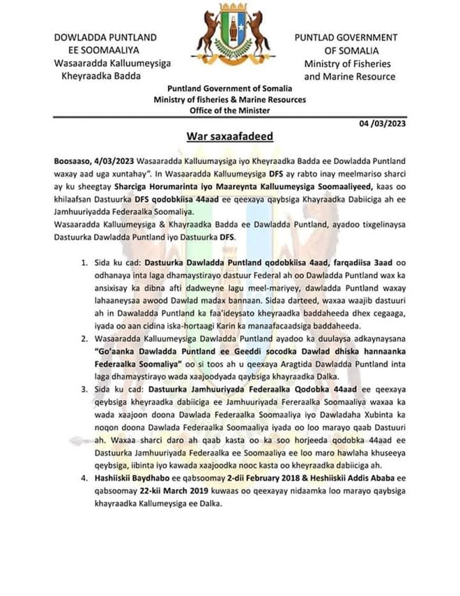 Sidoo kale, Wasaaradda Kalluumaysiga iyo Khayraadka Badda ee Puntland waxay sheegtay in aysan aqoonsanayn kuna dhaqmi doonin sharci kasta oo baalmarsan dastuurka Puntland iyo kan Dowladda federalka.
