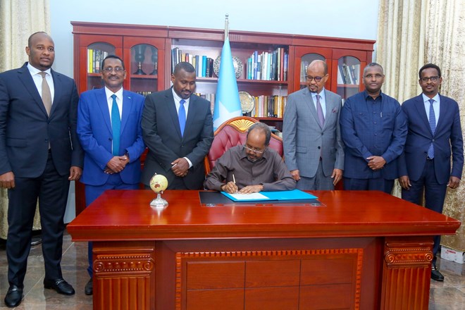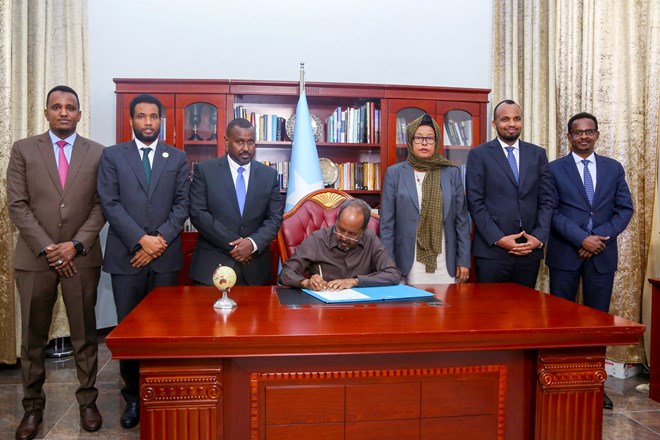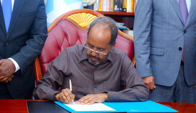 Arbaco, Maarso, 8, 2023 (HOL) - Madaxweyne Xasan Sheekh ayaa caawa saxiixay sharciga Cunaqabataynta Maaliyadeed ee Cayiman, Sharciga Hay'adda Sirdoonka iyo Nabad-sugidda Qaranka iyo Sharciga Korontada Qaranka.