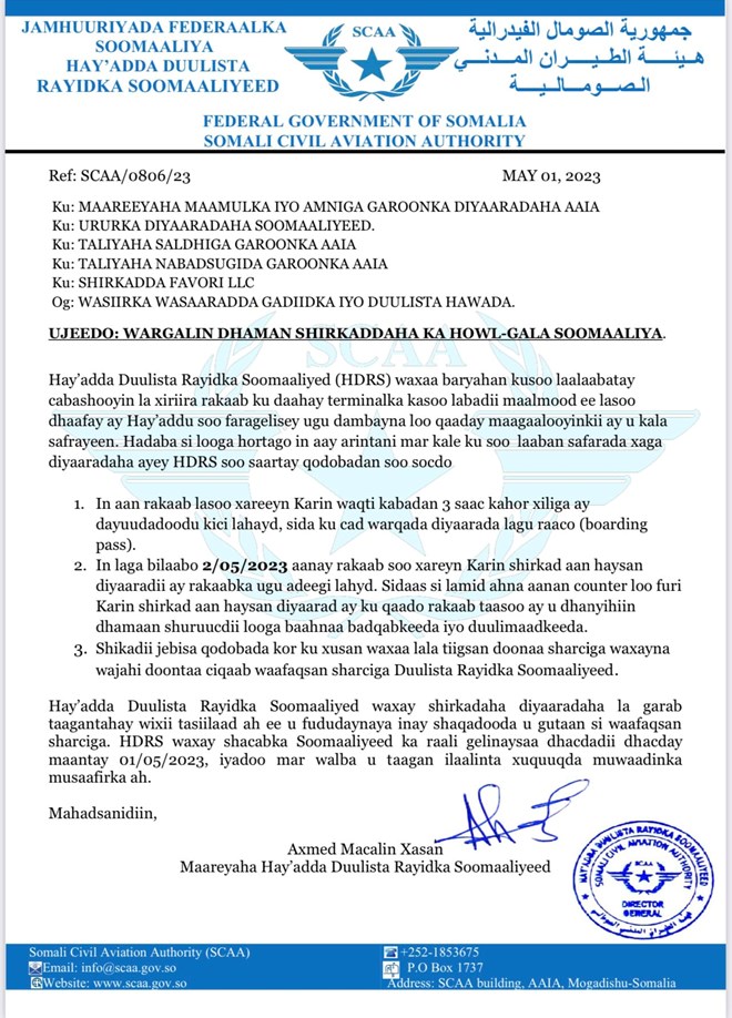 Talaado, May, 2, 2023 (HOL) - Hay'adda Duulista Rayidka Soomaaliyeed ayaa soo saartay qoraal digniin ah oo ku socda shirkadaha duulimaadyada gudaha dalka oo cabasha xoogan kasoo gudbiyeen rakaabka isticmaala diyaaradaha u kala duula gobolada dalka.