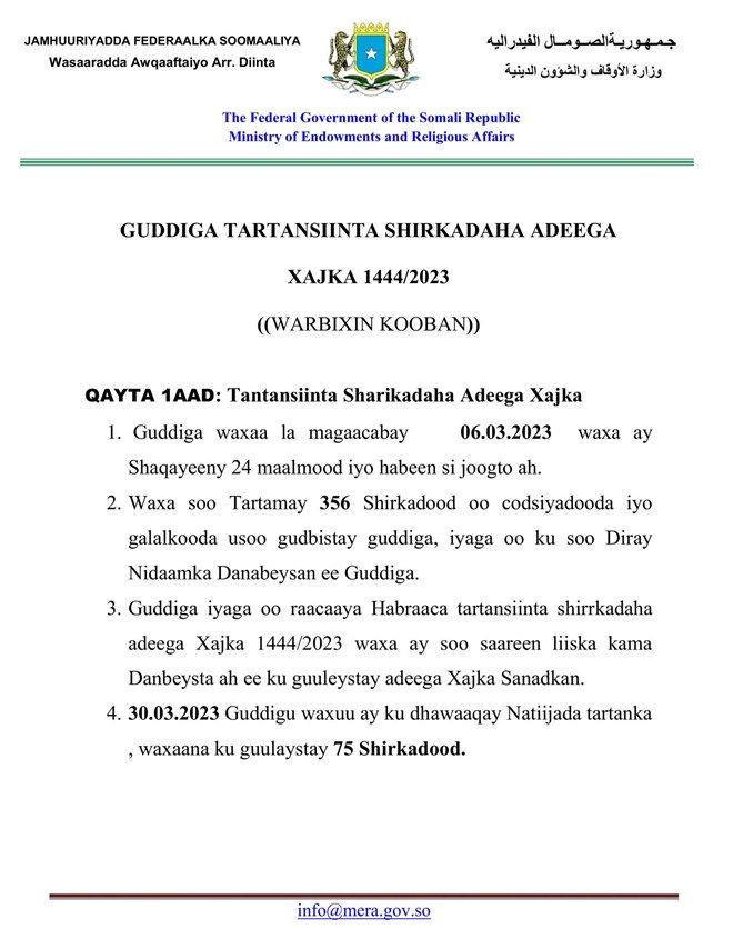 Talaado, May, 2, 2023 (HOL) - Raysul wasaaraha Soomaaliya Xamse Cabdi Barre ayaa ku dhawaqey qiimaha Xajka sanadkan, kaddib munaasabad galabta ka dhacdey Xarunta Wasaaradda Awqaafta iyo Arrimaha Diinta ee magaalada Muqdisho.