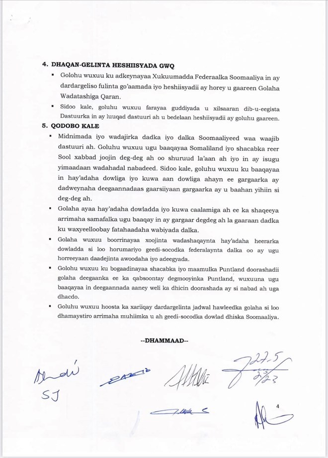 Axad, May 28, 2023 (HOL) - Golaha wadatashiga qaran ee Soomaaliya ayaa xalay goor dambe war saxaafadeed kasoo saaray shirkii uga socday magaalada Muqdisho, iyagoo heshiis ka gaaray arrimaha doorashada.