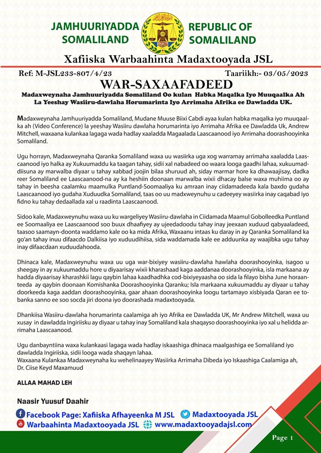 newsinsideMadaxweynaha oo kulan fogaan arag ah la yeeshay Wasiiru-dowlaha Horumarinta iyo Arrimaha Afrika ee Dowladda Ingiriiska Andrew Mitchell, ayaa ku wargaliyay in Somaliland diyaar u tahay in xal nabadeed laga gaadho xaalada Laascaanood, lakiin laga saaro ciidamo beeleedka gurmadka u yimid.