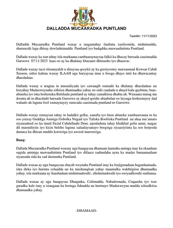 Sabti, November, 11, 2023 (HOL) - Midowga Musharixiinta mucaaradka Puntland ayaa shir ay ku yeesheen magaaalada Garoowe, waxay ku baaqeen in xal nabadeed lagu dhameeyo hubanti la’aanta siyaasadeed ee ka jirta Puntland xilligan kala guurka ah.
