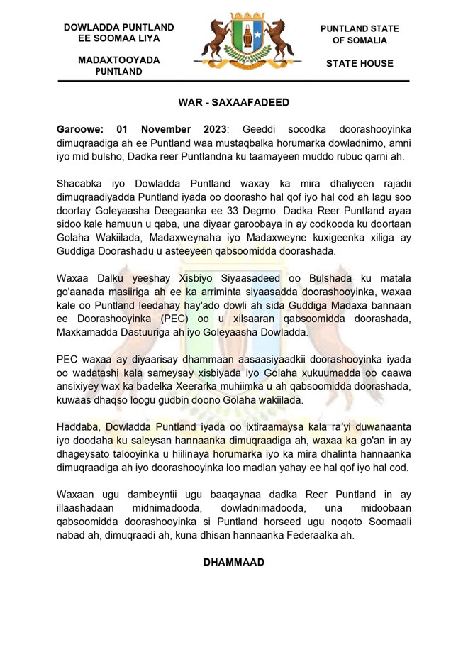Khamiis, November, 2, 2023 (HOL) - Madaxweynaha Puntland Siciid Deni ayaa kasoo horjeestay baaqii kasoo baxay isimada Puntland, kuwaas oo sheegay in aanay doorasho qof iyo cod ah dhici karin, iyagoo soo jeediyay in dib loogu laabto nidaamka qabaliga ahaa.