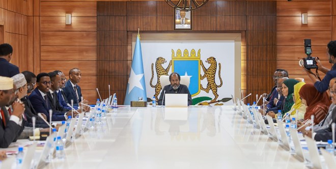 Khamiis, October, 12, 2023 (HOL) - Madaxweynaha Soomaaliya Xasan Sheikh Maxamuud oo muddo labo bilood ah waqtigiisa kusoo qaatay magaalada Dhuusomareeb, dibna ugusoo laabtay magaalada Muqdisho, ayaa golaha wasiirrada la wadaagay guulaha uu ka gaaray howlgallada Shabaab dalka looga sifaynayo.