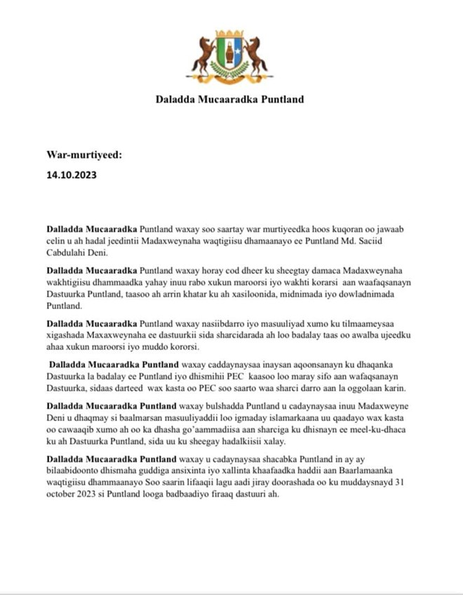 Sabti, October, 14, 2023 (HOL) - Dallada ay ku midaysan yihiin kooxaha mucaaradka Puntland, ayaa shaaciyay in aanay aqoonsanayn guddiga madaxa bannaan ee doorashooyinka Puntland ee PEC, kuwaas oo madaxweyne Deni uu xalay sheegay in ay qabanayaan doorasho qof iyo cod ah.