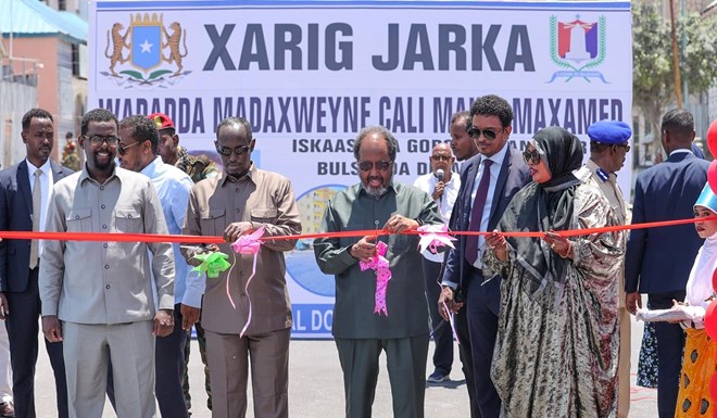 Axad, October, 15, 2023 (HOL) - Madaxweynaha dowladda Fedaraalka Soomaaliya Xasan Sheekh Maxamuud ayaa maanta xariga ka jaray wadada Maxamuud Xarbi ee degmada Warta Nabadda iyo wado cusub oo loogu magac daray madaxweynahii hore ee Soomaaliya Cali Mahdi Maxamed oo ku taala degmada Cabdicasiis.