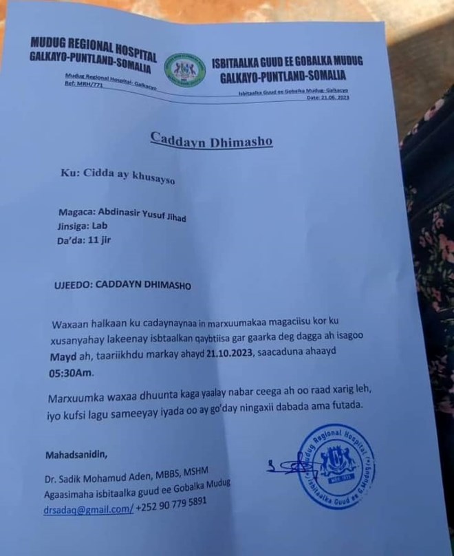 Axad, October, 22, 2023 (HOL) - Wiil yar oo kow iyo toban jir ah, ayaa fal isugu jiray kufsi iyo dil loogu geystay magaalada Gaalkacyo, sida lagu caddeeyay qoraal rasmi ah oo kasoo baxay maamulka isbitaalka guud ee magaalada Gaalkacyo.