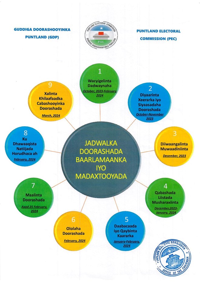 Talaado, October, 24, 2023 (HOL) - Guddiga doorashooyinka Puntland ee PEC, ayaa xalay waxay soo saareen jadwal doorasho oo muran badan dhaliyay, kaasoo ay ku xusan tahay, in ay isa saaran yihiin doorashada baalamaanka iyo tan madaxweynaha Puntland.