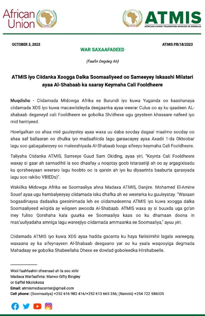 Arbaco, October, 4, 2023 (HOL) - Warsaxafadeed kasoo baxay taliska ciidamada ATMIS ayaa lagu shaaciyay in ciidamada Burundi iyo Uganda oo kaashanaya ciidanka dowladda Soomaaliya iyo kuwa dadka deegaanka iney si wadajir ah ula wareegeen deegaanka Cali fooldheere ee gobolka Shabeellaha Dhexe.