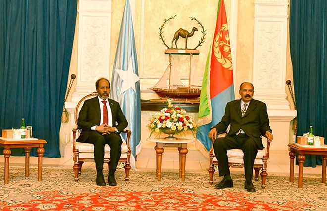 Kulankoodii ugu horeeyay oo ay ku yeesheen Aqalka Madaxtooyada, Madaxweyne Isaias Afwerki iyo Madaxweyne Xasan Sheekh Maxamuud ayaa si qoto dheer uga wada hadlay xoojinta xiriirka labada dal iyo sidoo kale horumarinta gobolka ee danaha labada dal.