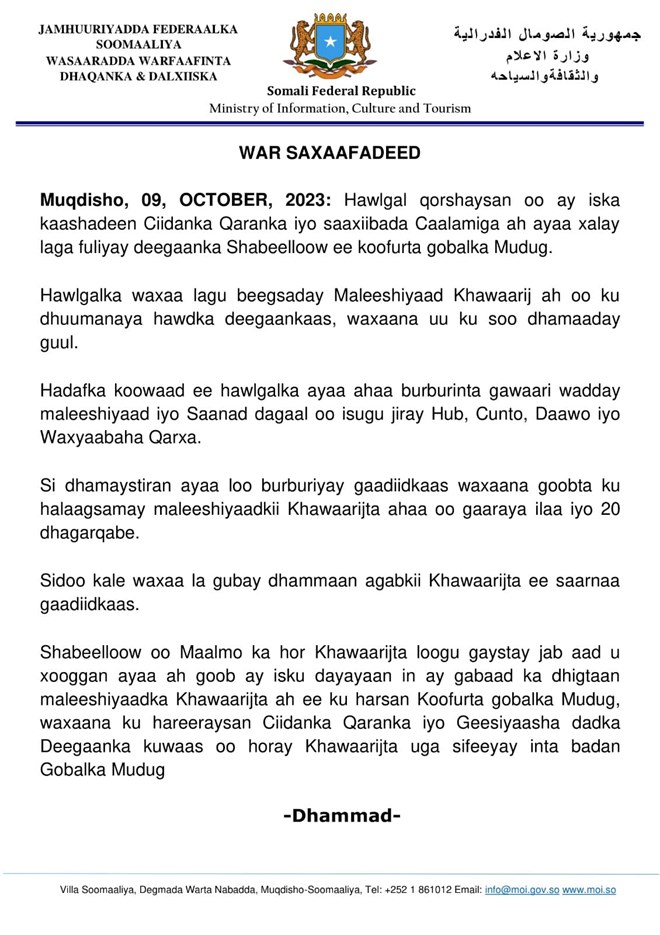 "Shabeelloow oo Maalmo ka hor Khawaarijta loogu gaystay jab aad u xooggan ayaa ah goob ay isku dayayaan in ay gabaad ka dhigtaan maleeshiyaadka Khawaarijta ah ee ku harsan Koofurta gobalka Mudug, waxaana ku hareeraysan Ciidanka Qaranka iyo Geesiyaasha dadka Deegaanka kuwaas oo horay Khawaarijta uga sifeeyay inta badan Gobalka Mudug" ayaa lagu yiri Warsaxafadeedka kasoo baxay Wasaaradda Warfaafinta Soomaaliya.