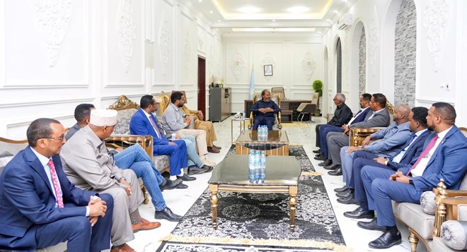 Khamiis, September, 21, 2023 (HOL) - Madaxweynaha dowladda fedaraalka Soomaaliya Xasan Sheekh Maxamuud ayaa maanta kulan kula qaatay aqalka Madaxtooyada maamulka Galmudug ee magaalada Dhuusamareeb guddoomiyaasha Golaha Shacabka iyo Aqalka sare ee Baarlamaanka Soomaaliya iyo Xildhibaano ka tirsan labada Gole oo maanta gaaray Dhuusamareeb.