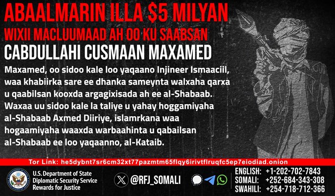 Jimco, September, 22, 2023 (HOL) - Dowladda Mareykanka ayaa kordhisay lacagaha dul saaran madaxa Cabdullaahi Cismaan Maxamed oo loo garasha ogyahay Injineer Ismaaciil Dhagacade oo kooxda Al-shabaab u qaabilsan farsamada qaraxyada, islamarkaana ah madaxa qeybta Warfaafinta Al-kataa'ib.