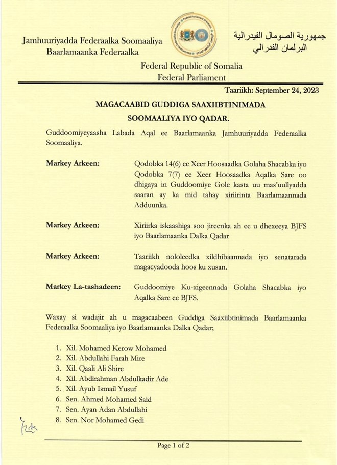 Isniin, September, 25, 2023 (HOL) - Guddoomiyaasha labada Aqal ee Barlamaanka Fedaraalka Soomaaliya Sheekh Aadan Maxamed Nuur Madoobe iyo Cabdi Xaashi Cabdullaahi ayaa si wadajir ah u magacaabay guddiyo cusub.