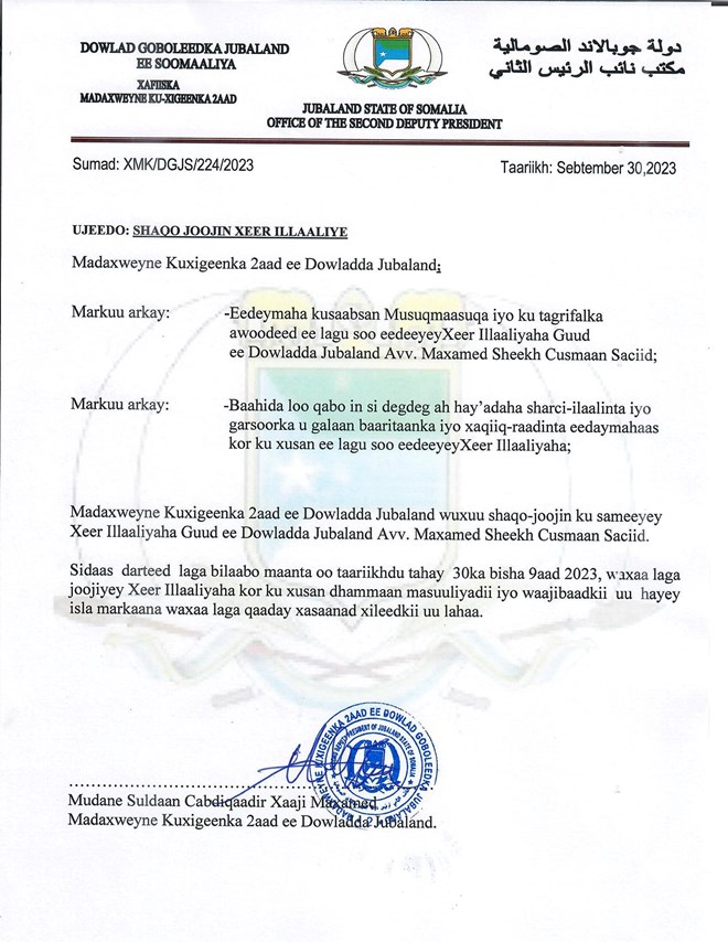 newsinsideWareegto uu soo saaray madaxweyne ku xigeenka labaad ee Jubbaland ayaa lagu sheegay in dhammaan laga joojiyay masuuliyaddii uu hayay, lagana qaaday xasaanadii iyo awooddii uu lahaa ilaaliyaha guud.