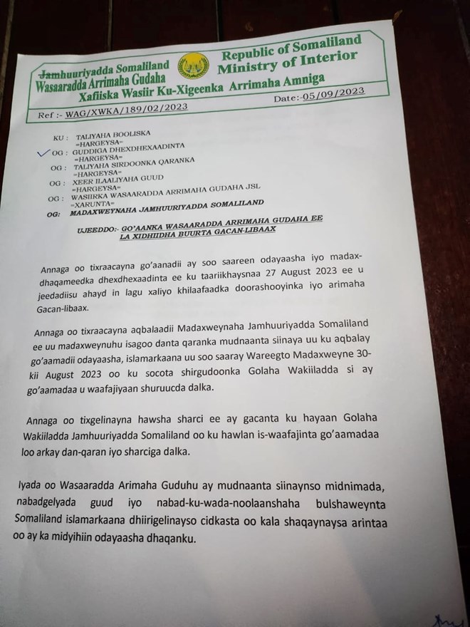 "Waxa ay wasaarada arrimaha guduhu soo saartay qoraalkan oo ay ku caddaynayso in aan dhallinyaradii hubka la fuushay buurta Gacan-libaax xukuumadu wax iliyo wax ay u raacaysa jirin, halkaana arrinkaa lagu soo xidhay" ayaa lagu yidhi qoraal kasoo baxay Wasaarada Arrimaha Guddaha Somaliland.