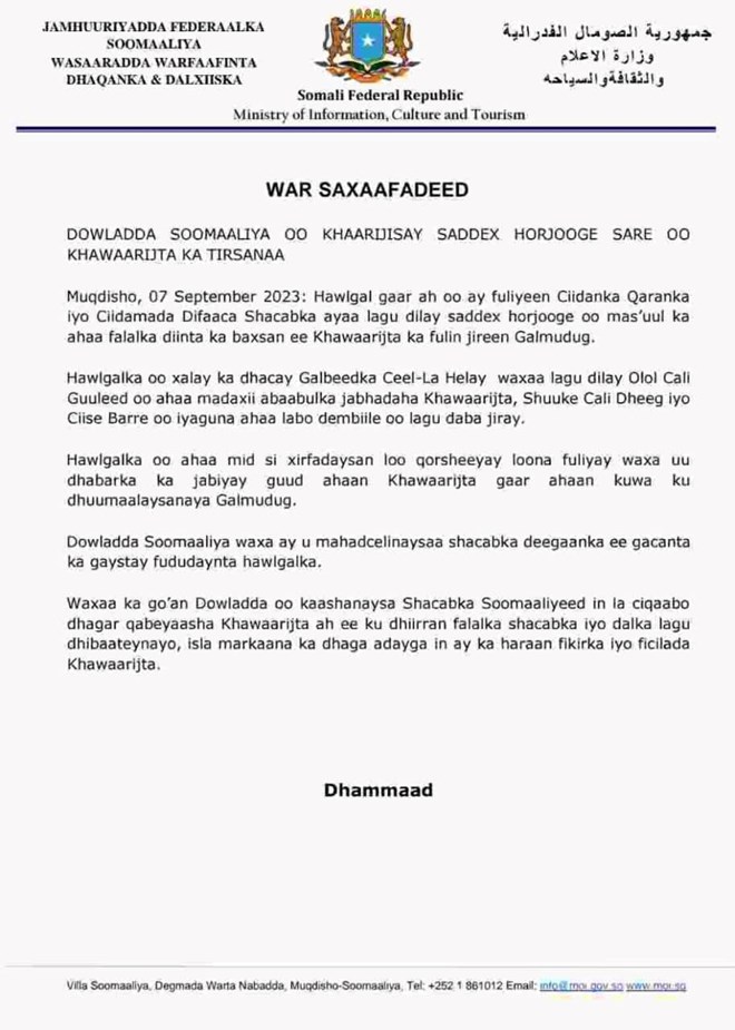 Khamiis, September, 7, 2023 (HOL) - Ciidamada Xoogga dalka Soomaaliyeed ayaa howlgal wadajir ah oo ay ka fuliyeen degaanada Galmudug waxa ay ku dileen saddex ka mid ah horjoogayaasha kooxda Al-Shabaab, sida ay sheegtay Wasaaradda Warfaafinta Soomaaliya.