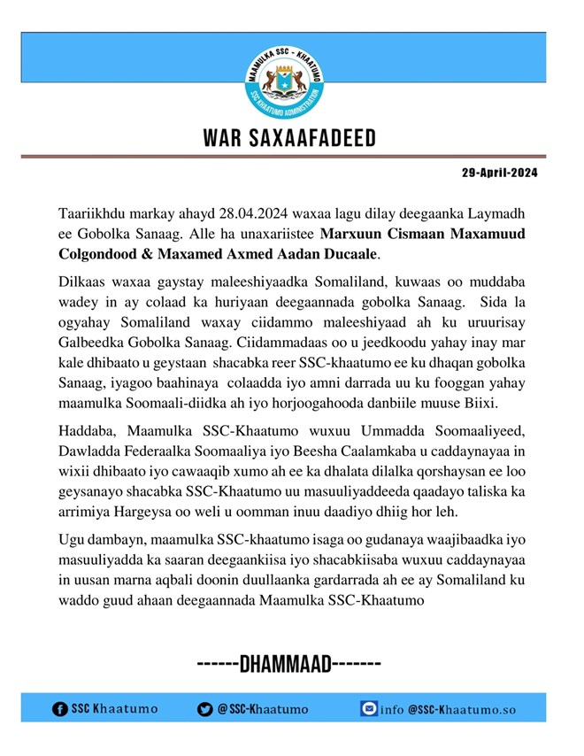 Talaado, April, 30, 2024 (HOL) - Maamulka SSC Khaatumo ayaa ku eedeeyay Somaliland inay colaad sokeeye ka hurinayaan degaanada gobolka Sanaag, ka dib markii maalmihii lasoo dhaafay halkaas lagu dilay labo qof oo shacab ah oo kasoo jeeday degaanada SSC.