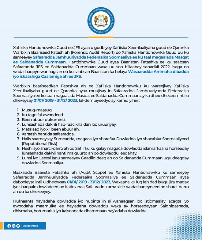 Ma ahan markii ugu horeysay oo Xafiiska Hantidhowrka guud ee qaranka u soo bandhigo warbixin baariseed ka dhan ah safaarado iyo hay’ado ka tirsan dowladda federaalka Soomaaliya, kuwaas oo qaarkood lagu helay kiisas xasaasi ah oo musuqmaasuq ah.