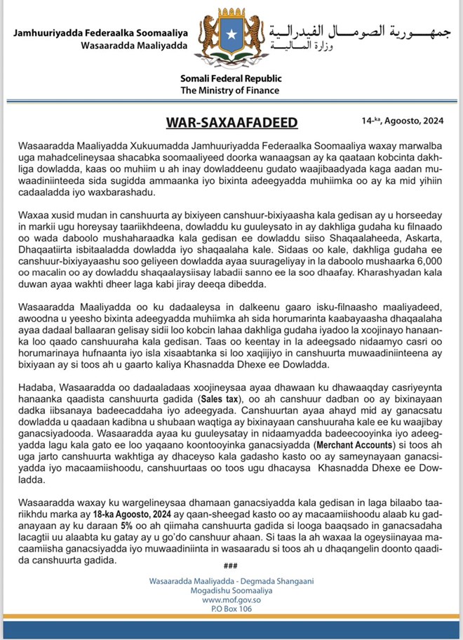 Jimco, Agoosto, 16, 2024 (HOL) - Wasaaradda Maaliyadda Xukuumadda Federaalka ah ee Soomaaliya ayaa amar ku bixisay in 18-ka bishaan dhammaan xarumaha ganacsiga ay dhaqan galiyaan canshuur dhan 5% ah oo laga qaadayo macaabiisha ka gata badeecadaha ama adeegyada.