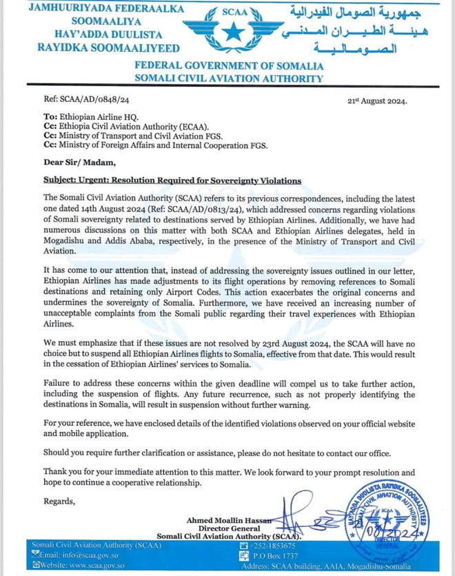 Hay’adda Duulista waxay siisay diyaaradda Ethiopian Airlines kama dambays inay 23 Agoosto 2024 wax ka qabato walaacyadaas. Hadii ay taasi dhici waydo waxay sheegtay inay keenayso in la hakiyo dhamaan duulimaadyadii Ethiopian Airlines ee Soomaaliya.