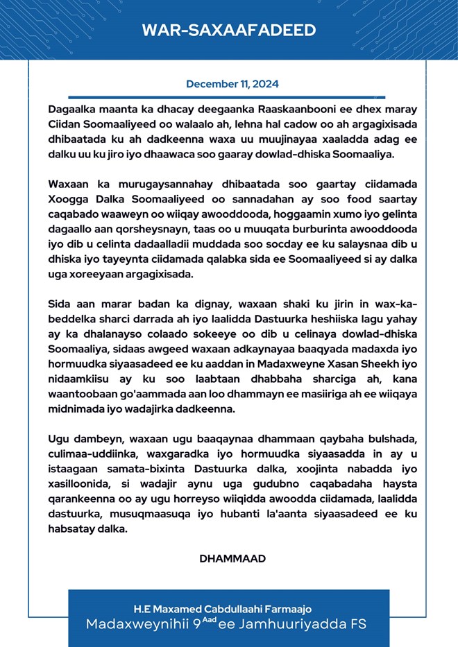 Khamiis, December, 12, 2024 (HOL) - Madaxweyne hore ee Soomaaliya Maxamed Cabdullaahi Farmaajo oo qoraal ka soo saaray dagaalkii Raaskambooni ayaa sheegay in wax laga xumaado ay ahayd in ciidan Soomaali ay dhexdooda dagaalamaan, waxaana uu ka digay in tani ay tahay mid uga soo dari karta xaalad adag ay ciidamadu xilligaani marayaan.